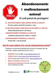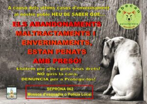 Una altra campanya que estem portant a terme a causa dels casos d’enverinaments que estan sortint al nostre poble i assabentats d’altres casos a pobles propers, és la de donar veu i difondre tota informació possible per evitar mals majors als nostres gossos, ja que són ells les víctimes d’aquesta gent sense escrúpols que perd temps de la seva vida pensant com fer mal als altres. És per això que Abecan vol que entre tots lluitem per ells per què els gossos no tenen veu, però nosaltres sí!