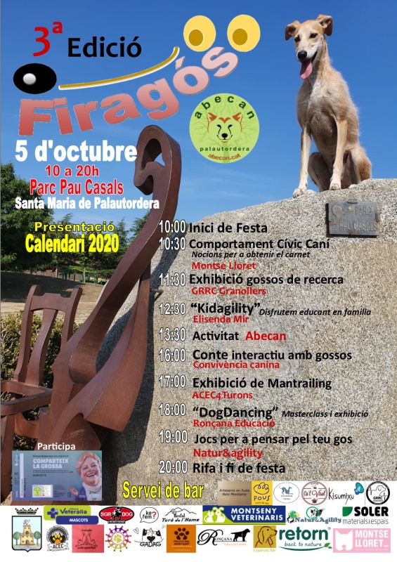 En aquesta Tercera edició de la fira hem compartit un dia d’activitats canines, exhibició de recerca i rescat (GRRC granollers) , circuit de kidagility (Elisenda Mir), el conte interactiu (Convivència Canina) i la masterclas i exhibició de Dogdancing (Ronçana educació). Presentació i venda del calendari Abecan 2020, amb molt d’èxit i loteria de la grossa, com cada any jugant amb els nostres números, i per acabar el dia, la rifa final de festa amb les aportacions de productes de Segurdog, Mascots Sant Celoni, Animalets Sant Esteve, Picart Sant Antoni de Vilamajor, Retorn, Veterinari Montseny i kisumixu, moltes gràcies per tot i per fer possible la nostra rifa.